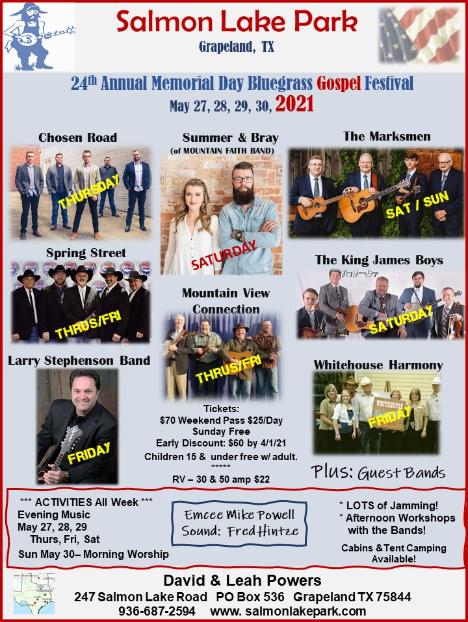 | 2021 March 26-27 Bluegrass Weekend - Perrin TX Great Escape North TX RV Park (formally Mitchell RV Park) Spring Street, Chords of Grace, Tin Top Road, Dalton Gang, Willow City *** March 27 - Industrial Strength Bluegrass - Wilmington, OH @ The Roberts Centre 1PM - Industrial Strength Bluegrass – Is Kentucky really the Bluegrass State? 1:15PM - Joe Mullins & The Radio Ramblers, 3PM - The Isaacs 5:15PM – Dinner Served 6:00PM – Industrial Strength Bluegrass – The Book and Recording: A Look Inside 6:30PM – The Caleb Daugherty Band, 7:30PM – Rhonda Vincent and The Rage Call I-Tickets ONLY if you CANNOT order online: 1-800-965-9324. *** April 10 - Andi and the Bluegrass Pals - Grapeland, TX @ The Station 914 Hwy 287 N (903) 513-4938 *** April 23, 24, 25, 2021- Bluegrass Heritage Festival - Farmers Branch, TX Wyndham Garden Dallas North Hotel 2645 LBJ Freeway Featuring: Lonesome River Band (Sat) , Byron Berline Band (Fri), Breaking Grass (Sat), The Purple Hulls (Fri & Say), Downtown String Band (Sat), Chords of Grace (Fri), Prairie Wind (Sunday) https://bluegrassheritage.org *** April 29 - The Isaacs - New Braunfels, TX The Brauntex Performing Arts Theater *** May 1 - The Isaacs - - Lufkin, TX - 7pm The Pines Theater 936 633 5454 for Tickets ($30, $35, $40) www.AngelinaArts.org *** May 1 - Little Roy & Lizzy / Malpass Bros - Lincolnton, GA - 4pm $50 - Fundraiser 147 Lumber Street littleroyandlizzyfest.com *** May 8 - Sandyland Bluegrass Reunion - Nacogdoches, TX Campsite jamming Thurs-Fri - May 6 & 7 Stage show Saturday @ 1pm Featuring: The Blake Brothers, Sabine River Bend, The Mountain View Connection The Right Direction, Tin Top Road....and more! 936 221 9736 or 254 338 8365 771 CR 141 *** May 14 - 31 - Bluegrass & BBQ - Silver Dollar City - Branson, MO *** May 14 - 15 - 1st Annual Bluegrass On The Trail Spring Festival - Cleburne, TX Pocket Change, Paluxy Pickers, Downtown String Band, Second Time Around, John Clayton Read, Algerita Hill, Copper Canyon, Bosque River Band 101 Chisholm Trail *** May 27, 2, 92, 30, 2021 - 24th Annual Salmon Lake Park Bluegrass Gospel Festival - Grapeland, TX Featuring: Summer & Bray (of Mountain Faith Band), Larry Stephenson, The Marksmen, Chosen Road, Mountainview Connection, Springstreet, White House Harmony, The King James Boys *** **** June 20-26 - Texarkana RV Music Park "Pickin" 64 Sam Thomas Road Texarkana, TX 903 244 0744 *** June 26 - Wylie Bluegrass On The Ballard - Wylie, TX FREE Event! BECKY BULLER BAND | THE FARM HANDS DEAN OSBORNE BAND | DOWNTOWN STRING BAND BOBBY GILES & TEXAS GALES | RANDY COLLIER & GRASSLAND Music starts at 1pm *** July 1,2,3 - 36th Annual Starvy Creek Summer Bluegrass Festival - Conway, MO Doyle Lawson & Quicksilver - Friday (1 show at 8:00 p.m.) Grascals - Saturday, Carolina Blue - Saturday, Springstreet - Friday Little Roy & Lizzy - Friday, Michael Cleveland & Flamekeeper - Saturday Crowe Brothers - Thursday & Friday, Possum Trot - Thursday Joe Mullins & The Radio Ramblers - Thursday, Junior Sisk - Friday & Saturday Lonesome Road - Friday & Saturday, Baker Family - Friday & Saturday Finley River Boys - Thursday & Saturday *** July 24-25 - Big Grass Bluegrass Festival - Paragould, AR Featuring: Rhonda Vincent, Russell Moore & IIIrd Tyme Out, The Cleverlys, High Fidelity, The Tenn Mafia Jug Band, Breaking Grass *** August 13, 14, 15 - 46th Annual Southwest Pickers Festival - Red River, NM Shawn Lane Family Band, Augusta Road, Hard Road Trio, the Badly Bent, Higher Ground Bluegrass, the Foggy Memory Boys, the Blue Canyon Boys, the Fritz Davis Band, Tucumcari Crossroads and more *** Sept 2, 3, 4, 5, 2021 - 45th Annual Salmon Lake Park Bluegrass Festival - Grapeland, TX Larry Cordle & Friends, The Little Roy & Lizzy Show, Kentucky Just Us, Classy & Grassy, Andi & The Bluegrass Pals, Tin Top Road, The Marksmen, Catahoula Drive, Sabine River Bend, Spillwater Drive & THE PURPLE HULLS *** *** September 10th & 11th - Bluegrass & Chili Festival - Waggoner, OK FREE admission! Featuring: Rhonda Vincent & The Rage, Doyle Lawson & Quicksilver, Balsam Range, The Cleverlys, The Grascals, Caleb Doughtery Band and more. *** September 16,17,18 30th Annual Fall Bluegrass Festival - Conway, MO Appalachian Road Show - Thursday, Rhonda Vincent & The Rage - Saturday Larry Stephenson Band - Friday, Special Consensus - Thursday Country Gentlemen Tribute Band - Saturday Tim Graves and Farmhands - Thursday & Friday Greg Blake Band - Friday & Saturday, Lorraine Jordan & Carolina Road - Friday Phillip Steinmetz & His Sunny Tennesseans - Friday & Saturday Danny Paisley - Thursday & Friday, That Dalton Gang - Saturday Big Mill - Saturday, Casey Freeland & Atta Boys - Saturday *** Sept 24 - 25 - Eddie Sanders EXTREME Bluegrass Music Festival - Eufaula, OK Featuring: Russell Moore & IIIrd Tyme OUt, Fast Track, Bobby Osborne & Rocky Top Express, Alecia Nugent, Appalachian Road Show, Eddie Sanders, The Crouch Brothers, Joe Hott, Bonham Brothers, Heartland Express, Springstreet xtremebluegrass.com *** Oct 6 - 9 - Turkey Track Bluegrass Festival - Waldron, AR Featuring: Rhonda Vincent & The Rage, Springstreet, The Little Roy & Lizzy Show, & more tba *** Oct 8 - Rhonda Vincent & The Rage - Lufkin, TX The Pines Theater *** Oct 15 & 16 - Bloomin Bluegrass - Farmers Branch, TX tba.... *** Nov 11 - 13 - Joe Mullins & Radio Ramblers So Ohio Music Festival - Wilmington, OH *** November 11-13 - Mountain View Arkansas Bluegrass Festival Ozark Folk Center Featuring: The King James Boys, Ralph Stanley II, Dave Adkins Russell Moore and IIIrd Tyme Out, Kody Norris Show SideLine, Shannon Slaughter, Gravel Yard Bluegrass Band The Ellis Family, Spillwater Drive *** ****NOTE**** Check ahead before traveling long distances. This service is provided strictly as a courtesy to friends and bluegrass enthusiasts and is not for profit. My primary objective is to publish BLUEGRASS events but may on occasion elect to publish other items at my discretion. - Julie Tucker |